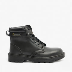 Waxy Leather uppers, textile linings, padded collar, steel toe plate. Nitrile rubber treaded sole. Non marking, ladder grip, heat, oil, acids resistant, non clog sole.